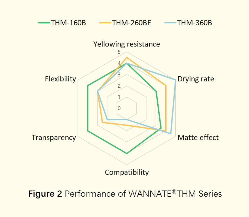 WANNATE® THM-160B has the best compatibility, being easily compatible with resins and low-polarity solvents. Additionally, it has excellent transparency and flexibility and is suitable for both glossy and matte paint.