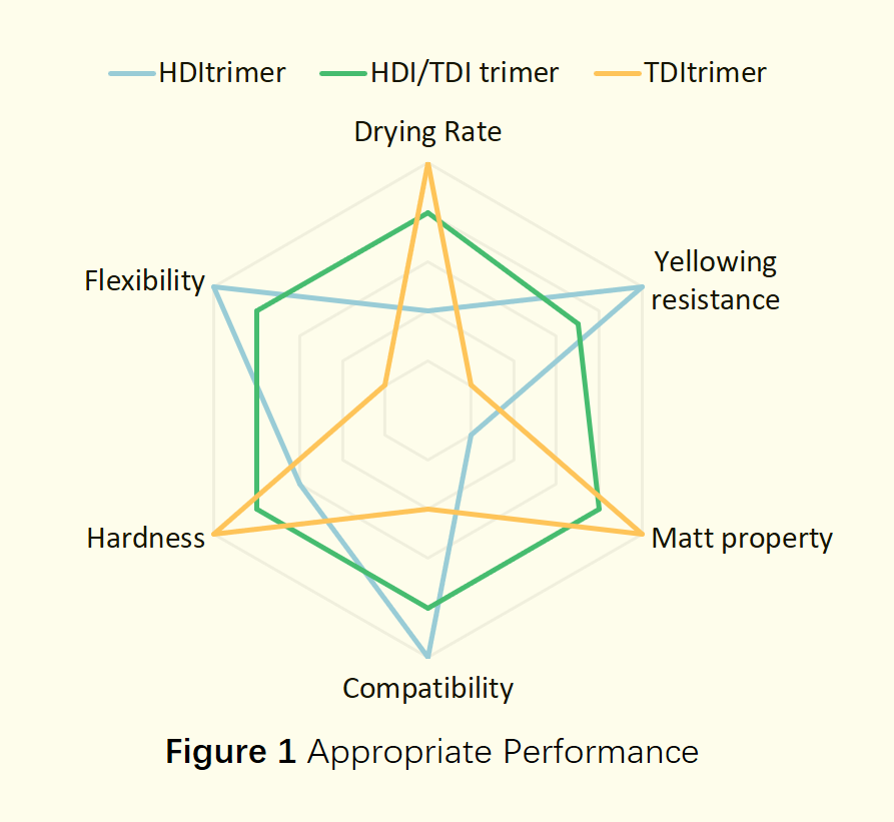 The WANNATE® THM series is a type of polyisocyanate solution based on HDI-TDI, usually applied in two-component polyurethane curing agents. The combination of aliphatic isocyanate resistance to yellowing and quick drying and high hardness characteristics from aromatic isocyanate makes the coatings based on WANNATE® THM process good yellowing-resistance, fast curing, relatively balanced performance. It’s suitable for outdoor and semi-outdoor (balcony, window sill) wood coating applications. (Figure 1) Also, the THM series can be used both directly and after dilution.